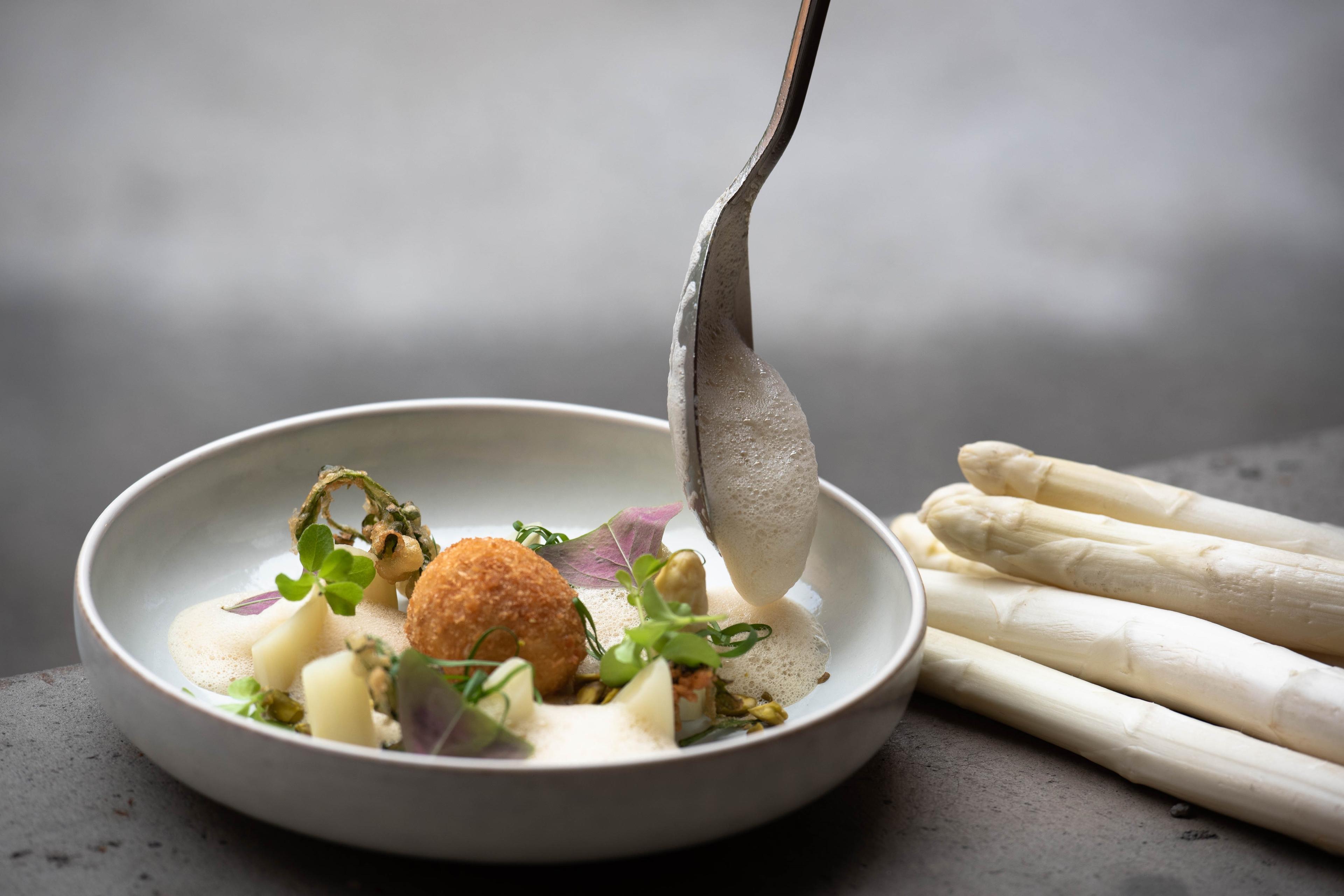 Hvit asparges med sitrongress, sprø egg, smurt aspargesbuljong og pistasjnøtter