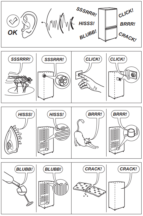 Knakende lyd eller en knitrende lyd. Sprekkelyd eller smellelyd 2-10 ganger om dagen. Dette er normale driftslyder. Regelmessig avriming av bakveggen 2-10 ganger daglig øker temperaturen på fordamperen, som er plassert i bakveggen. Isolasjonsmaterialet og kjølevæskerørene utvider seg og trekker seg sammen igjen, og denne normale avrimingsprosessen produserer denne lyden. Erfaring har vist at denne lyden reduseres over tid.