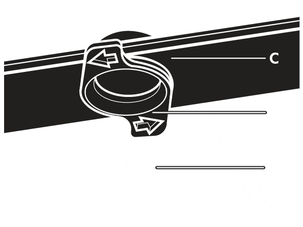 1. For å løsne sprayarmen (C) fra tilførselsrøret (A) , drei monteringselementet (B) mot klokken og trekk sprayarmen nedover.